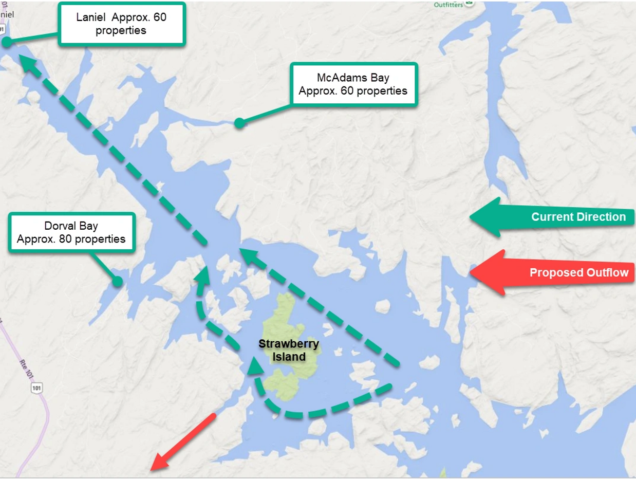 The Onimiki Project is split between two generating centres, Onimiki South has a generator of 7 Kw in Temiscaming and Onimiki North is designed for a 60 Kw generator south of Laniel on Lake Temiscaming. The Onimiki North proposes diverting up to 80% of the current flow of water away from the Kipawa River and down a constructed tunnel 10 kilometers away from the current dam in Laniel. This change in lake currents and reduction of flows is concerning for the 10 km portion of Lake Kipawa affected by this change, and the Kipawa River. The map below outlines the proposed change in current and flow.